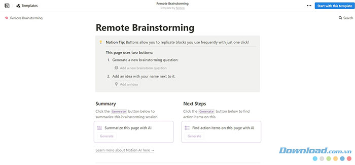 Mẫu Remote Brainstorming Template của Notion là một công cụ dành cho các nhóm cộng tác. Nó cung cấp một không gian để tạo ra các ý tưởng, phác thảo chiến lược và trực quan hóa các khái niệm, giúp cho các phiên brainstorm trên Notion trở nên dễ dàng.