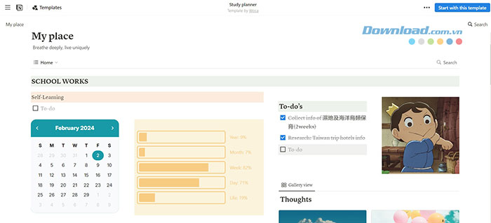 Đối với sinh viên, dù là sinh viên đại học hay những người tham gia các khóa học tự học vì sở thích riêng, mẫu kế hoạch học tập là một công cụ không thể thiếu để thành công. Với thiết kế tối giản, tạo cảm giác ấm cúng, Study Planner có thể hỗ trợ tổ chức các khóa học, tạo lịch học và theo dõi tiến độ trên hành trình học tập của mỗi người.