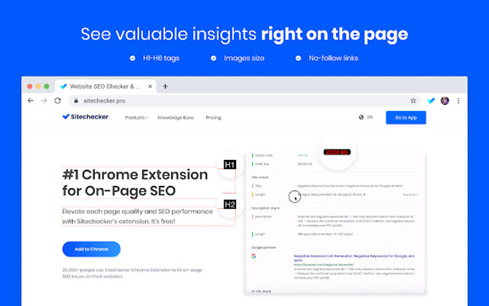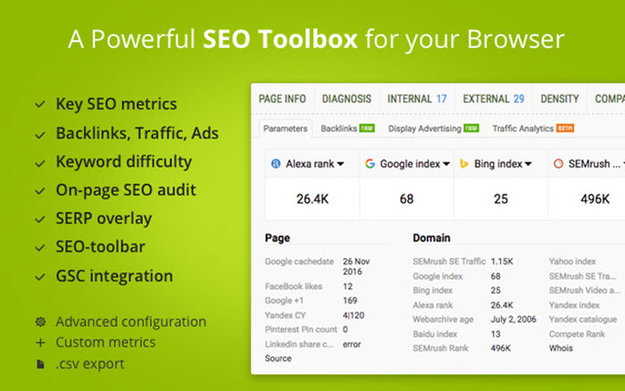 Đây là công cụ phân tích SEO trên trang với nhiều công cụ, giúp người dùng tiết kiệm thời gian và tăng năng suất. SEO Extension [Metrics, Backlinks, On-Page] kiểm tra tất cả các chi tiết meta của một trang và hiển thị phác thảo. Nó cũng kiểm tra tất cả các liên kết để đảm bảo rằng không có liên kết nào bị lỗi, đồng thời xem có bao nhiêu backlink một cách nhanh chóng.