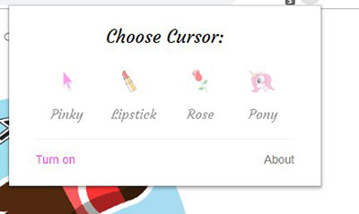 Tiện ích mở rộng này đã trở nên phổ biến nhờ những mẫu con trỏ dễ thương mà nó cung cấp. Mặc dù Cute Cursors chỉ cung cấp một số kiểu con trỏ là con trỏ màu hồng, son môi, hoa hồng và ngựa con. Mỗi mẫu trỏ đều đẹp mắt và có cách hoạt động riêng.