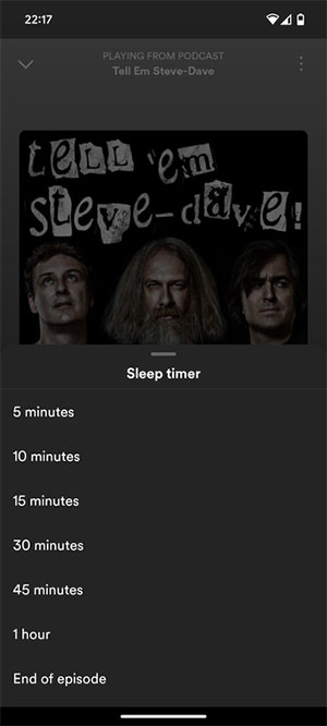 Nếu muốn ngủ trong khi nghe nhạc hoặc podcast, người dùng có thể đặt Spotify ngừng phát sau một khoảng thời gian cụ thể. Đồng hồ hẹn giờ ngủ của Spotify có sẵn cho Android và iOS và mọi người có thể đặt hẹn giờ trong tối thiểu 5 phút và tối đa 1 giờ.
