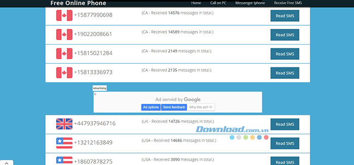 Tin nhắn mới nhất từ tất cả các số được gộp vào cuối cửa sổ chính. Trang web có 8 số điện thoại công khai để lựa chọn, vậy nên tránh sử dụng nó cho bất kỳ thứ gì liên quan đến tài khoản ngân hàng hoặc thẻ tín dụng của mình.