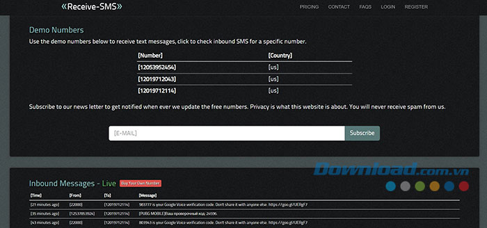 Receive SMS là trang web cho phép nhận tin nhắn SMS miễn phí mà không cần đăng ký hay xác minh. Hạn chế duy nhất là tất cả các tin nhắn người dùng nhận được sẽ hiển thị trên trang chính, không có gì bị chặn hoặc ẩn khỏi chế độ xem công khai.