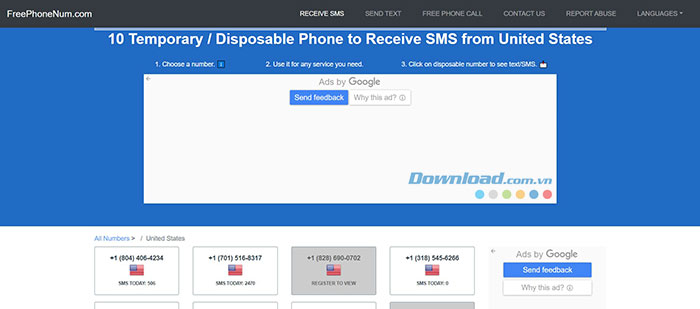 Receive SMS đã tồn tại được vài năm và trên thực tế, đây là một trong số ít trang web vẫn hoạt động tốt dù ra mắt từ lâu (trang còn lại là Sellaite). Nó từng có 6 số có trụ sở tại Châu Âu nhưng hiện tại có 4 số từ Hoa Kỳ.