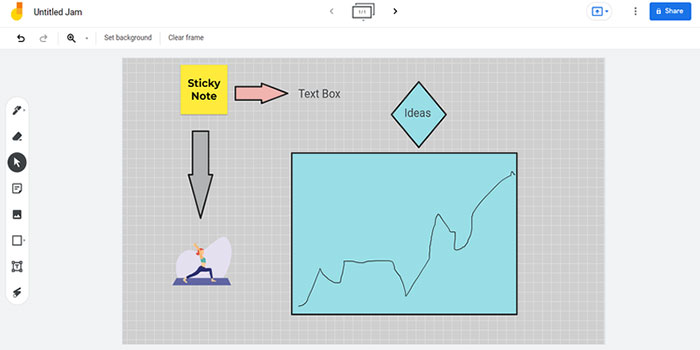 Google Jamboard cũng đi kèm với một số hình nền để lựa chọn hoặc tải lên hình nền của riêng mình. Cũng giống như tất cả các tệp của Google, nút Share cho phép gửi nó tới những người khác để cùng làm việc và trình bày trước một cuộc họp qua Google Meet.