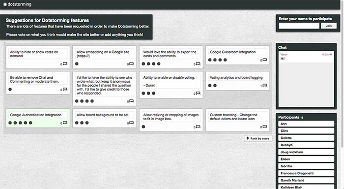 Dotstorming là nền tảng bảng kỹ thuật số miễn phí, nơi các thành viên có thể làm việc trên nhiều dự án và bỏ phiếu cho các ý tưởng. Mọi người có thể tạo Wall, Voting Board và Collage, dù ít nhưng vẫn đáp ứng nhu cầu làm việc tối thiểu.