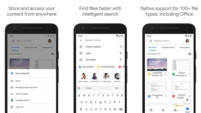Điều làm cho Google Drive trở nên đặc biệt là bộ ứng dụng Android được đính kèm với nó, bao gồm Google Tài liệu, Google Trang tính, Google Trang trình bày, Google Photos, Gmail, Google Calendar và Google Keep.