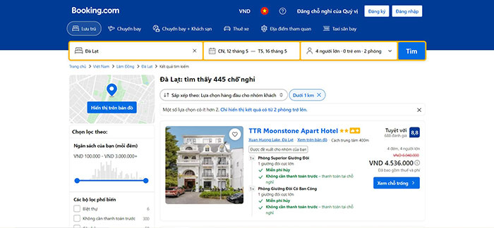 Đặt khách sạn, biệt thự,... với hơn 4.000.000 chỗ ở bằng ngôn ngữ và đơn vị tiền tệ chính mình lựa chọn. Dễ dàng đặt chỗ ở theo sở thích với các bộ lọc, ảnh độ phân giải cao, chế độ xem bản đồ, thông tin địa phương và hơn 35 triệu đánh giá đã được xác minh của khách du lịch.