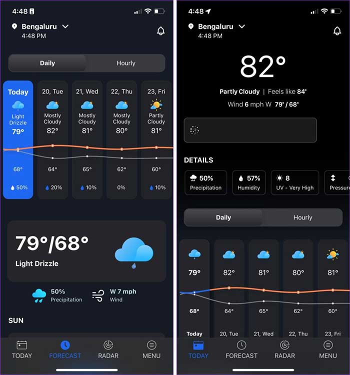 1Weather có giao diện người dùng tốt nhất, hiển thị chi tiết dữ liệu về nhiệt độ và lượng mưa. Nó chủ yếu làm nổi bật thông tin lượng mưa, độ ẩm, chỉ số UV và áp suất, những thông tin mà người dùng muốn biết nhất dưới dạng tóm tắt về thời tiết trong ngày.