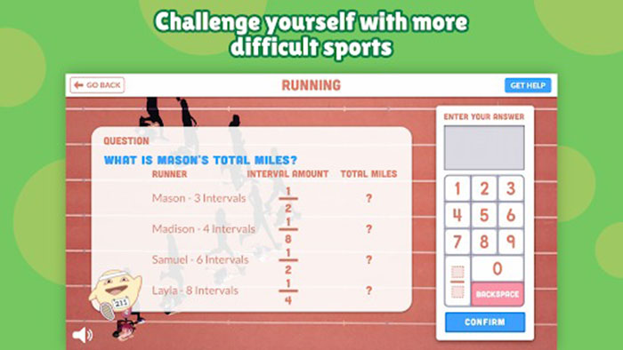 Math Fluency with Sports được thiết kế để thực hành các kiến thức toán học bằng cách chơi 11 trò chơi khác nhau. Ứng dụng này cung cấp điểm số thực tế, sau đó yêu cầu người dùng xác định tổng và chênh lệch về điểm số hoặc thực hiện phép tính. Ứng dụng này được các trường học sử dụng để giúp học sinh dành nhiều thời gian thực hành các phép toán hơn.