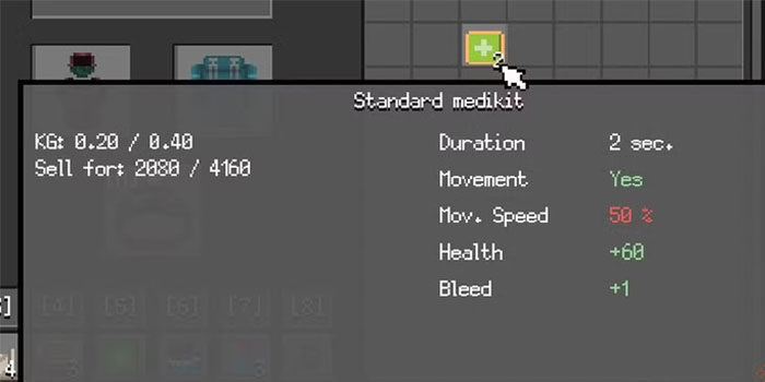 Điều đáng chú ý là khi sử dụng Standard Medkit, bất kể cấp độ nào, người chơi sẽ bị khóa tại chỗ. Nhân vật sẽ ngồi yên trong vài giây và hơi lâu một chút khi đang trong quá trình chữa lành. Trừ khi ở một nơi an toàn thì việc dùng Standard Medkit có chút bất lợi. Tuy nhiên, đây là cách chữa lành nhanh và rẻ nhất vì game thủ cần nó trong hầu hết giai đoạn đầu trò chơi.