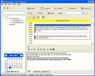 Total Organizer là 1 dạng kết hợp của cây thư mục và các tag đánh dấu. Chú ý là nếu bạn tạo các thư mục con (phân mục con) thì khi mở 1 thư mục, bạn sẽ thấy tất cả những thứ nằm trong nó, và cả nội dung của các thư mục con của nó. Vì thế khi mở thư mục cao nhất root, bạn sẽ thấy tất cả mọi thứ bạn đã lưu trữ.