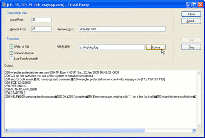 Sử dụng chương trình rất đơn giản, chỉ cần chạy Trivial Proxy và cấu hình nó cho redirect đến 1 cổng nào đó, cấu hình chương trình sử dụng cổng đó và localhost. Sau đó bạn sẽ thấy tất cả mọi hoạt động đang diễn ra của các ứng dụng khác. Chương trình hỗ trợ các giao thức HTTP (web), HTTPS (web bảo mật), POP3 (nhận email), SMTP (gửi email), NNTP (newsgroups). Trivial Proxy hoạt động tốt với IE, Firefox, Outlook,....