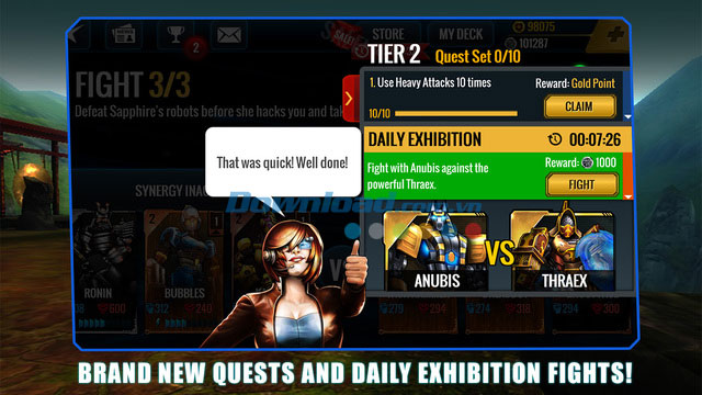 Vuốt và chạm vào kẻ thù trong trận chiến 3 đấu 3, sử dụng các bước di chuyển quen thuộc của người máy và tận dụng siêu combo trong các đòn tấn công. Làm đầy thanh sức mạnh để sử dụng kiểu tấn công đặc biệt, các thủ thuật chiến đấu có một không 2 để trở thành người chiến thắng!