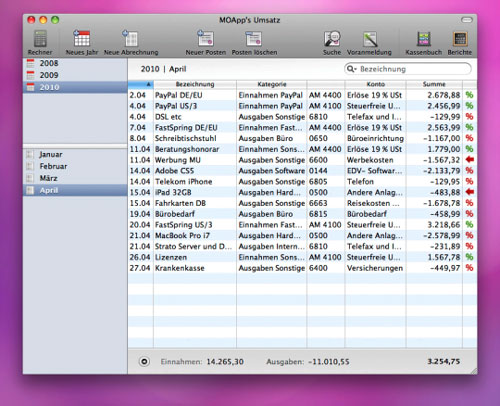 Umsatz giúp công việc kế toán và làm thuế trở nên dễ dàng. Hãy chú ý rằng Umsatz được viết riêng cho hệ thống tài chính và thuế của Đức, Vì vậy hiện nay chương trình chỉ chạy trên nền tiếng Đức. Các ngôn ngữ khác vẫn đang trong quá trình thực hiện.