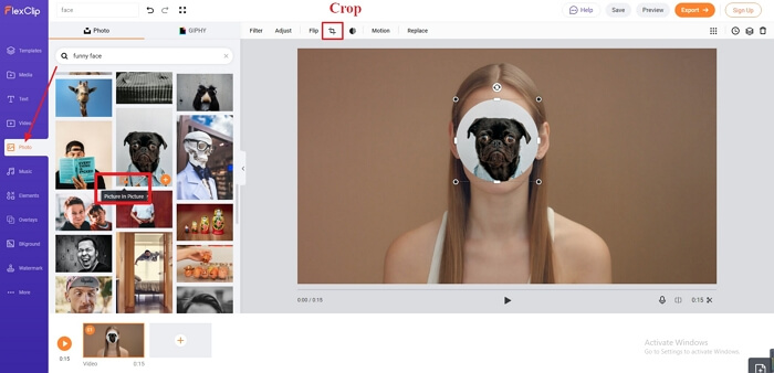 Để thay thế bằng ảnh tĩnh, nhấn vào tab Photo và tìm kiếm funny face. Sau đó, người dùng có thể chọn ảnh để hoán đổi khuôn mặt trong video thông qua tính năng ảnh trong ảnh.
