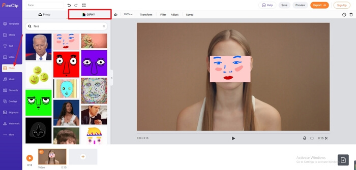 Để thay bằng ảnh động, điều hướng đến Photo > GIPHY > tìm kiếm face. Sau đó, chọn một GIF để hoán đổi khuôn mặt trong video.
