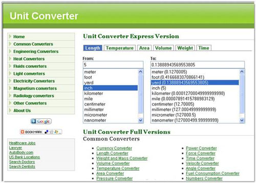 Unit Converters chào đón người dùng bằng giao diện hết sức đơn giản, hiển thị rõ từng nội dung đo kèm bảng công cụ chuyển đổi ngay phía trên màn hình. Nếu đem so sánh giao diện của dịch vụ Unit Converters với dịch vụ Online Conversion thì có phần phức tạp hơn, nhưng danh mục các hệ thống đo lường được phân loại rõ ràng hơn, thuận tiện hơn cho người dùng. Ở giữa trang có các thẻ Length- độ dài, Temperature- nhiệt độ, Area- diện tích, Volume- thể tích, Weight- khối lượng, Time- thời gian. Bên dưới các thẻ này là các nhóm được phân loại khá khoa học: Common- nhóm đơn vị dành cho người dùng phổ thông, Engineering- nhóm đơn vị dùng trong ngành kỹ thuật, Electricity- đơn vị dùng trong ngành điện, Heat- nhóm đơn vị dùng cho nhiên liệu, Magnetism- nhóm đơn vị dùng trong ngành từ học, Fluids- đơn vị đo môi trường chất lỏng,…