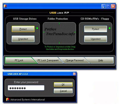 Nếu bạn không muốn bất kỳ ai có thể sử dụng đĩa flash drive, ổ CD-ROM, ổ đĩa mềm trên máy tính của mình thì chương trình USB Lock AP sẽ giúp bạn thực hiện điều này một cách dễ dàng. Chương trình rất dễ sử dụng, bạn chỉ cần nhấn nút Protect vào các thiết bị cần bảo vệ, chương trình sẽ tự động mã hóa và không cho phép người dùng sử dụng chúng. Nếu muốn bảo vệ thư mục nào, bạn chỉ việc kéo và thả các thư mục đó vào phần Foder Protection trong giao diện chính của chương trình. Khi muốn truy cập vào các thiết bị và thư mục được bảo vệ, bạn phải đánh đúng mật mã của chương trình mới được.