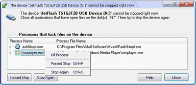 Sử dụng các lệnh Kill process, Forced Stop hoặc Stop Again để chấm dứt sự hoạt động của các chương trình đang truy cập vào USB và đảm bảo đóng các chương trình liên quan trước khi ngắt kết nối.