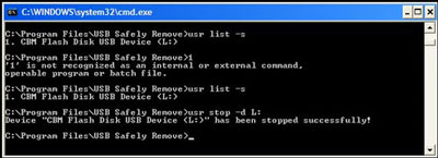 6. Ngoài ra USB Safely Remove 4 còn cung cấp chức năng quản lý kết nối USB theo cơ chế dòng lệnh thông qua chế độ CMD của Win XP: vào CMD và nhập vào dòng lệnh truy xuất tới chương trình được cài đặt trên ổ cứng, nhập thêm lệnh usr list -s vào cuối, lúc này thông tin chi tiết các thiết bị phần cứng kết nối sẽ được hiển thị, và để ngắt kết nối ta nhập vào lệnh usr stop -d.