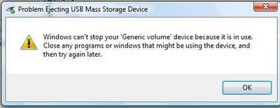 Tuy nhiên, đôi khi thực hiện công việc này, bạn lại nhận được hộp thoại thông báo thiết bị không thể ngưng kết nối, hoặc thiết bị đang được sử dụng. Lý do của tình trạng này có thể do một file, chương trình nào đó trên USB đang được hệ thống sử dụng, hoặc USB bị nhiễm virus, và virus trên USB đang hoạt động trên hệ thống.