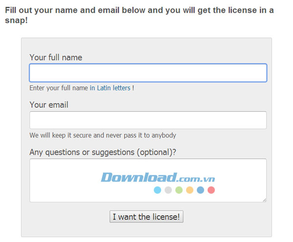 Truy cập vào LINK, nhập tên và email, nhấn nút 'I Want The License'. Sau đó đăng nhập email đã đăng ký để nhận mã và đường dẫn tải file cài đặt. Cài đặt phần mềm bình thường và nhập mã kích hoạt khi được yêu cầu.