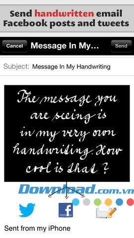 Chia sẻ ghi chú viết tay với bạn bè chưa bao giờ dễ dàng đến thế! Ngoài ra, ứng dụng Use Your Handwriting Gold còn mang đến cho người dùng tính năng độc đáo đầu tiên trên iPhone - đó là danh sách đa màu sắc đặc biệt để tạo tính nghệ thuật cho các ghi chú. Hãy tạo các tấm thiệp đầy màu sắc và cá nhân hóa cho các dịp đặc biệt trong năm và gửi qua Email tới những người thân yêu, hoặc cắt và dán chúng trong các ứng dụng khác, chẳng hạn như tin nhắn đa phương tiện MMS.