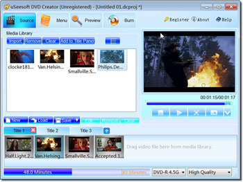 Ứng dụng uSeesoft DVD Creator có thể giúp người dùng chuyển đổi và ghi đĩa các video thành các tập tin DVD (DVD folder, ISO) và đĩa DVD (DVD 5, DVD 9) một cách dễ dàng với chất lượng cao. Với chương trình này, bạn có thể chuyển đổi và ghi các video với định dạng như WMV, AVI, MP4, ASF, 3GP, MOV, DivX, DAT, MPEG... sang DVD. Bạn có thể lưu giữ các bộ phim yêu thích hoặc các khoảnh khắc đáng nhớ của gia đình và bạn bè vào đĩa DVD.