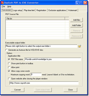 Các tập tin có thể được sao chép vào bất kỳ máy tính nào mà được cài đặt Adobe Reader 8.0 trở lên. Chương trình có thể tạo các tập tin EXE đầu ra được cá nhân hóa. Chẳng hạn bạn có thể đặt hình ảnh biểu tượng riêng cho tập tin đầu ra và cấu hình bức ảnh của bạn trước và sau khi chơi PDF. VaySoft PDF to EXE Converter không chỉ hỗ trợ ảnh JPG, BMP, EMF mà còn cả PNG, GIF do đó, bạn có thể tạo giao diện chào mừng động.