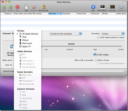 VideoMonkey hỗ trợ chuyển đổi hầu hết các định dạng video thông dụng hiện nay và là công cụ rất hữu ích để chuyển đổi video cho iPod, iPhone và các thiết bị cảm ứng iPhone. Đối với các kết nối, nó được phát triển đặc biệt cho Mac, và chỉ hỗ trợ các thiết bị Apple.