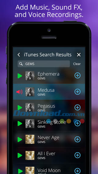 Nhập tệp tin nhạc từ danh mục iTunes phong phú và chọn hiệu ứng âm thanh phù hợp để thêm vào video. VidLab cho phép điều chỉnh toàn diện âm lượng audio và phần âm thanh tăng dần, giảm dần ở đầu và cuối mỗi bộ phim.
