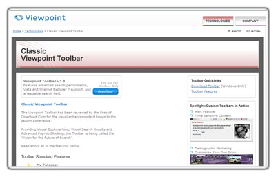Viewpoint Toolbar mang đến cho bạn một phương thức độc nhất vô nhị và rất tiết kiệm thời gian trong việc lướt web và tìm kiếm bằng cách cho phép bạn xem trước các kết quả tìm kiếm bằng các bức ảnh thu nhỏ thời gian thực và cùng với các đoạn văn bản chú giải nội dung. Bạn có thể dễ dàng lưu trữ, tìm kiếm và chia sẻ các địa chỉ ưa thích bằng chính phương thức kể trên.