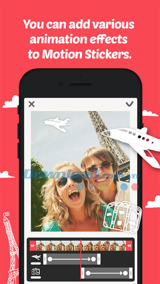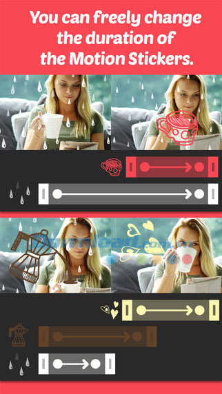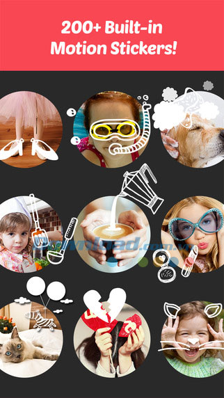 Sử dụng những hình dán sticker động (Motion Stickers) của Vimo để biến hóa thành những thước phim vui nhộn và thú vị hơn. Những sticker động của Vimo chính là các clip hoạt họa từ 50 đến 100 khung hình, xuất hiện trong video dưới dạng ảnh động định dạng GIF.