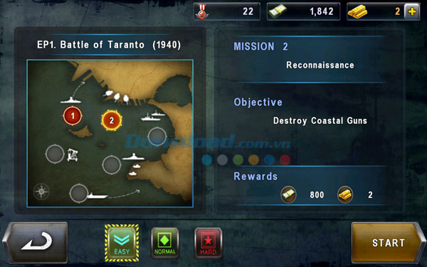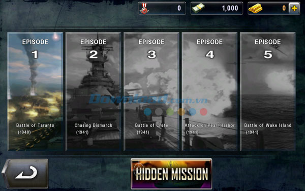 Game cung cấp 11 tập tương ứng với các địa điểm vào mốc thời gian diễn ra chiến tranh từ những năm 40-43 của thế kỷ trước. Mỗi tập lại được chia ra làm 5 nhiệm vụ nhỏ. Mỗi trận thủy chiến cho phép người chơi lựa chọn 3 mức độ dễ - trung bình - và khó để thử sức. Điểm kinh nghiệm và tiền thưởng phụ thuộc vào sức chiến đấu và độ thách thức mà bạn chọn.
