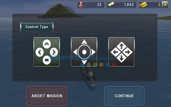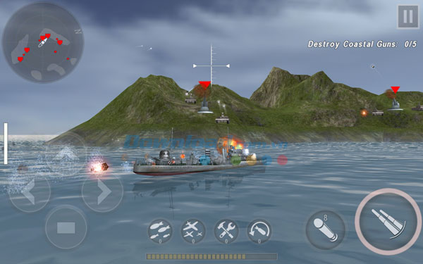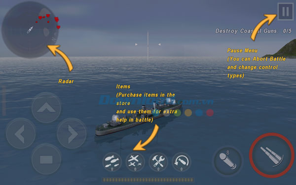 Cũng không khó để bạn có thể làm chủ các nút chức năng điều khiển như bắn súng, 4 nút bên trái dùng để di chuyển con tàu, thanh HP nằm bên dưới màn hình biểu thị cho sức chịu đựng của tàu, vòng tròn radar cho phép bạn theo dõi vị trí của bạn và địch, biểu tượng target giữa màn hình cho phép nhắm chuẩn vị trí địch, và một số biểu tượng máy bay, bom, vv nằm phía dưới màn hình yêu cầu mua trong cửa hàng là các bổ trợ giúp tiêu diệt kẻ thù nhanh và mạnh hơn. Lưu ý, bạn cũng có thể lựa chọn loại phím điều khiển phù hợp.