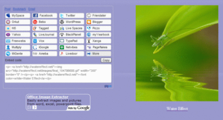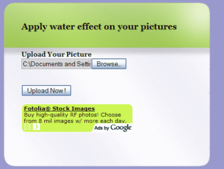 Thông thường khi bạn muốn thêm các hiệu ứng độc đáo cho ảnh, kiểu như hiệu ứng nước phản chiếu vào ảnh, bạn thường nghĩ ngay đến việc phải cài đặt và sử dụng các công cụ đồ họa chuyên nghiệp như Photoshop. Tuy nhiên không phải ai cũng có khả năng sử dụng phần mềm này thành thạo. Water Effect là một dịch vụ trực tuyến, hoàn toàn miễn phí, cho phép bạn thêm vào ảnh tĩnh hiệu ứng nước phản chiếu rất nhanh chóng và dễ dàng, mà không cần bạn có bất kỳ kiến thức về đồ họa nào.