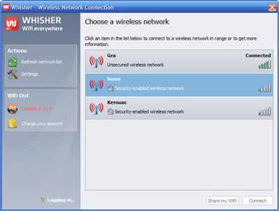 Khi muốn kết nối vào một hotspot, bạn sẽ dụng phần mềm Whisher thay cho tiện ích kết nối thông thường của Windows XP hoặc phần mềm của Wi-Fi card. Khi bạn ở nhà và sẵn sàng mở kết nối của mình, hãy chỉ thị cho Whisher rằng bạn muốn chia sẻ và sẽ có được chứng chỉ trong tài khoản của mình. Sau đó bạn có thể sử dụng các chứng chỉ này khi ở xa nhà. Nếu bạn không có đủ chứng chỉ trong tài khoản để trả cho truy cập hotspot thương mại thì có thể mua một số chứng chỉ của Whisher.