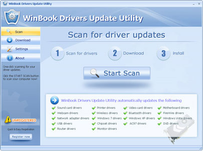 WinBook Drivers Update Utility cập nhật các hệ thống driver cho các thiết bị WinBook của bạn một cách tự động chỉ với một cú nhấp chuột. Nó trước hết sẽ quét hệ thống của bạn sau đó tải về và cài đặt các driver WinBook chính thức để cho thiết bị của bạn làm việc đúng.
