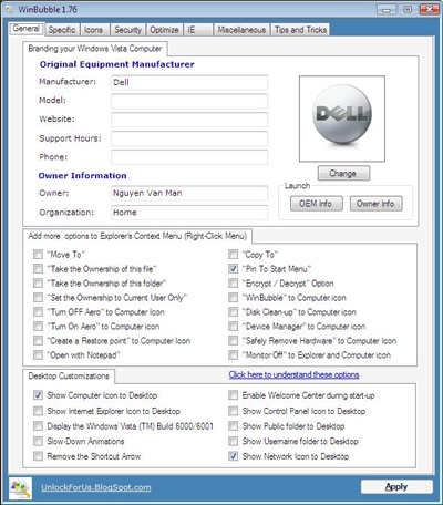- General: Nơi bạn chỉnh sửa các thông tin đăng ký máy, logo nhà sản xuất, tinh chỉnh menu chuột phải như thêm, bớt các thành phần Copy to, Move to… và thiết lập hiển thị cho một số thành phần của Windows Vista trên desktop như shortcut bật, tắt chế độ Aero, tắt màn hình.