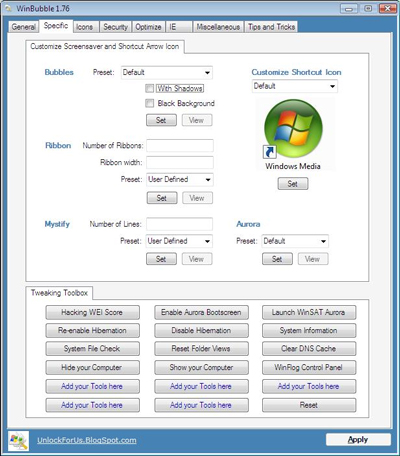 - Special: thiết lập các tùy chọn cho screensaver, bỏ mũi tên trước shortcut. Mục Tool có một số chức năng như đổi màn hình khởi động qua giao diện Aurora, điều khiển WinFlog, xóa cache của DNS, thiết lập các chế độ ngủ đông… và cho phép bạn thêm các công cụ khác vào để dễ quản lý. - Icons: tại đây bạn có thể thực hiện việc thay đổi các icon mặc định củaWindows và thay đổi biểu tượng cho từng ổ đĩa. Theo XHTT