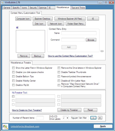 - Miscellanerous: tinh chỉnh, thêm bớt các thành phần trong menu chuột phải của Windows Explorer, IE… Nếu muốn thêm thành phần nào vào, bạn gõ tên vào ô Name, trong ô Command bạn nhấp Browse để tìm đến file thi hành và nhấp Add. Bạn cũng có thể không cho hiện thông báo khi dung lượng trống ổ đĩa xuống thấp, không cho phép sử dụng hiệu ứng Flip 3D, loại bỏ Map/ Disconnect Network Drive trong menu chuột phải khi nhấp chọn Computer…