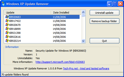 Windows XP Update Remover là tiện ích giúp bạn xóa các tập tin sao lưu các bản vá cập nhật Windows XP một cách an toàn, cũng như gỡ các bản vá vừa mới cài đặt nhanh chóng.