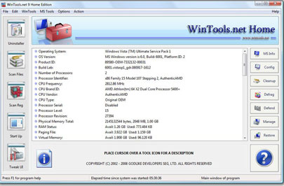 WinTools.net là một bộ công cụ giúp tăng hiệu suất hệ điều hành MS Windows. WinTools.net gỡ bỏ sạch sẽ phần mềm không mong muốn từ các ổ đĩa cứng và các tham số đã hết hiệu lực từ MS Windows registry. WinTools.net cho bạn quyền kiểm soát tiến trình khởi động của Windows, giám soát bộ nhớ và tùy chỉnh các thiết lập desktop và hệ thống để phù hợp với những nhu cầu của bạn. Cải thiện tốc độ và sự ổn định cho kết nối của bạn. Đảm bảo sự riêng tư của bạn và giữ an toàn thông tin nhạy cảm của bạn.