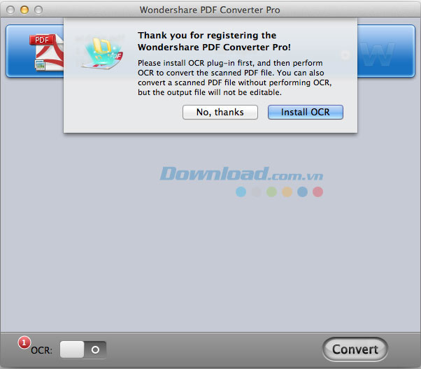 OCR chỉ có sẵn trên Wondershare PDF Converter Pro for Mac. Khởi chạy ứng dụng này và kéo file PDF được scan vào nó. Khi file PDF được scan và tải lên ứng dụng, bạn sẽ nhìn thấy một biểu tượng màu đỏ xuất hiện bên cạnh nút OCR. Hãy chuyển nút OCR sang chế độ ON. Nếu đây là lần đầu tiên bạn sử dụng tính năng OCR này, một cửa sổ sẽ xuất hiện và thông báo để bạn cần cài đặt plug-in OCR trước. Sau đó, nhấn nút "Install OCR".
