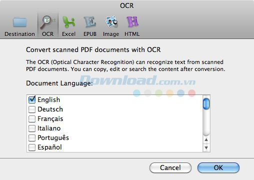 Trước khi chuyển đổi tập tin PDF được quét, bạn cần lựa chọn đúng ngôn ngữ cho tài liệu đầu ra. Để làm điều này, hãy truy cập PDF Converter Pro -> Preference... -> OCR.