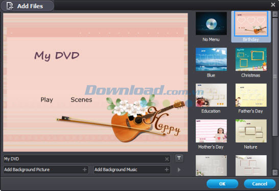 Bước 2: Nhấn tùy chọn “Change template” ở phía bên phải để mở cửa sổ “Burn to DVD”. Ở đây, bạn có thể chọn trình đơn DVD yêu thích, thêm nhạc và ảnh nền đặc biệt.