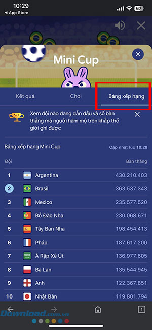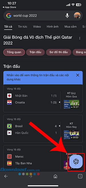 Bước 3: Sau khi trang kết quả tải xong, mọi người sẽ thấy một nút màu xanh lam với quả bóng đang xoay tròn nằm ở góc dưới cùng bên phải của giao diện. Hãy nhấn vào đó để truy cập trò chơi Mini Cup.