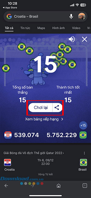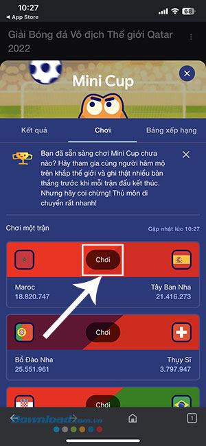 Bước 7: Sau khi kết thúc trò chơi, mọi người có thể nhấn Chơi lại để tiếp tục thử sức với Mini Cup.