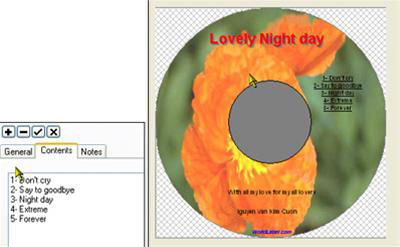 Trong thẻ Content, bạn có thể chọn để in danh sách các bài nhạc có trong CD để người nhận có thể dễ dàng mở nhanh các bản nhạc mà người ấy thích.